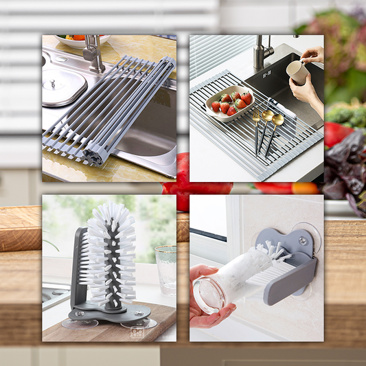 Σετ Ανοξείδωτη Βάση Νεροχύτη Που Διπλώνει & Διπλή Βούρτσα Καθαρισμού Ποτηριών