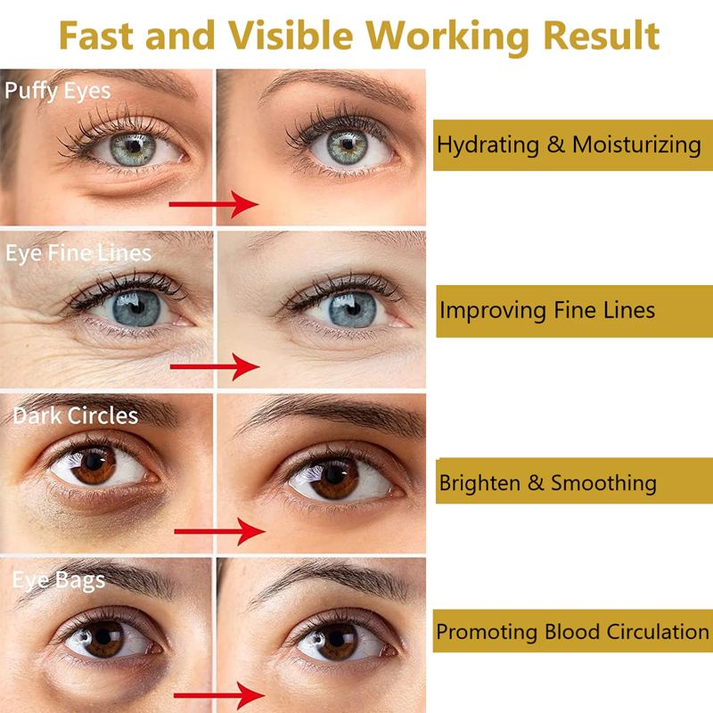 "Μου συνέστησαν αυτό το προϊόν το οποίο πραγματικά με εξέπληξε όταν άνοιξα το καπάκι, με μια απαλή μυρωδιά, η μάσκα ματιών περιέχει χρυσά σωματίδια, φαίνεται πολύ φανταχτερή. Βάζω πρώτα τις μάσκες ματιών στο ψυγείο και στη συνέχεια τις εφαρμόζω στο πρόσωπό μου. Είναι μια πολύ χαλαρωτική ρουτίνα, μπορώ να τη χρησιμοποιώ κάθε μέρα και να βλέπω ένα μόνιμο αποτέλεσμα! Μετά από ένα μήνα χρήσης, οι σακούλες κάτω από τα μάτια μου έχουν εξαφανιστεί! Και δεν είμαι πρησμένη το πρωί μετά την εφαρμογή της το προηγούμενο βράδυ. Αυτός είναι ο λόγος για τον οποίο εξακολουθώ να το χρησιμοποιώ για να έχω καλύτερα αποτελέσματα". --45, Αλεξάνδρα Τ., Σπάρτη, Ελλάδα