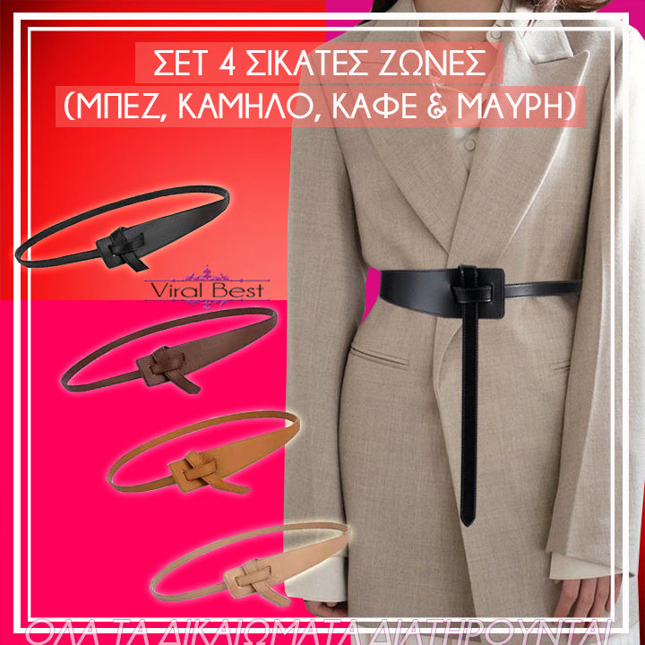 • Σικάτες: Αποκτώντας το σετ, παραλαμβάνετε τέσσερις (4) ζώνες στα πιο σικάτα, κλασικά και διαχρονικά χρώματα της αγοράς (μπεζ, καμηλό, καφέ και μαύρο)! Φορώντας τες, θα ξεχωρίζετε ανάμεσα στο πλήθος, αφού φανερώνουν μία γυναίκα, η οποία γνωρίζει από μόδα και ξέρει να ντύνεται!