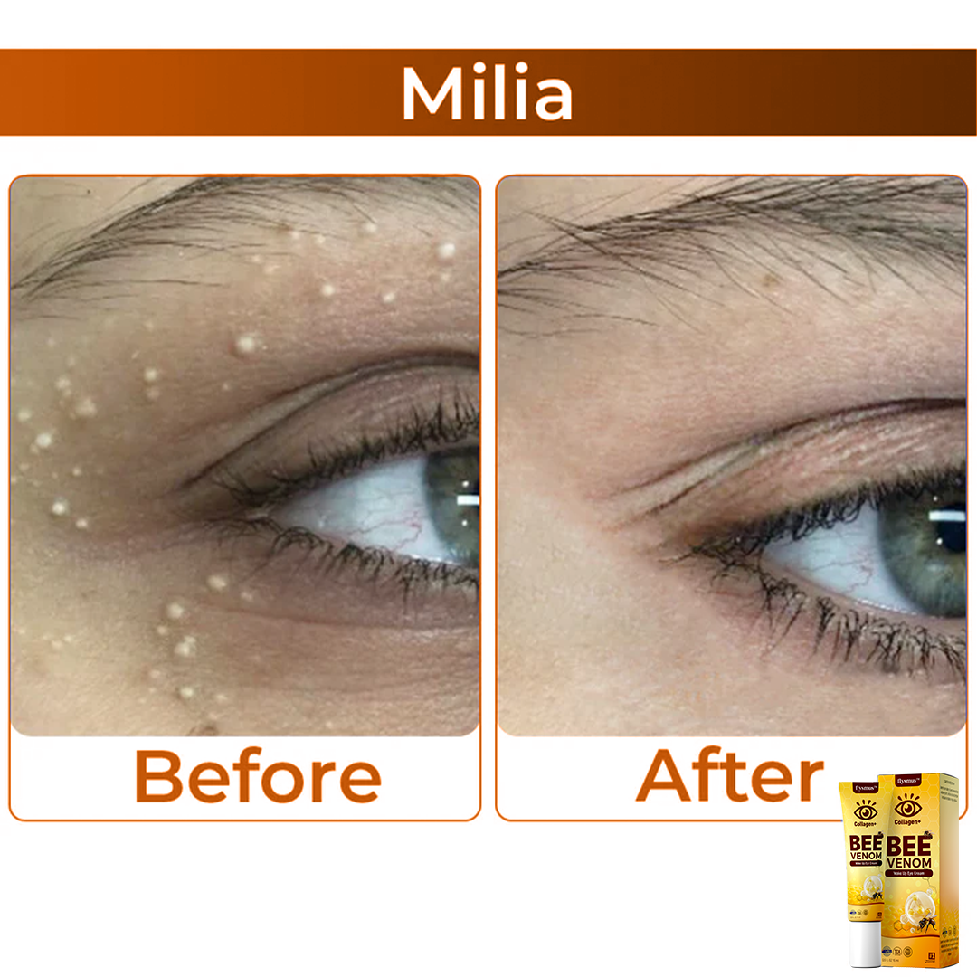 Το δηλητήριο της μέλισσας μπορεί να βοηθήσει στην ομαλοποίηση της παραγωγής λιπαρότητας του δέρματος γύρω από τα μάτια, ρυθμίζοντας τα επίπεδα σμήγματος, μειώνοντας τις πιθανότητες φραγμένων πόρων που μπορεί να οδηγήσουν σε κηλίδες σε αυτή την ευαίσθητη περιοχή. Το δηλητήριο της μέλισσας προάγει ένα ισορροπημένο περιβάλλον του δέρματος, συμβάλλοντας στη μείωση των υφιστάμενων μιλίων και στην πρόληψη του μελλοντικού σχηματισμού τους, με αποτέλεσμα ένα πιο λείο και καθαρό δέρμα γύρω από τα μάτια.
