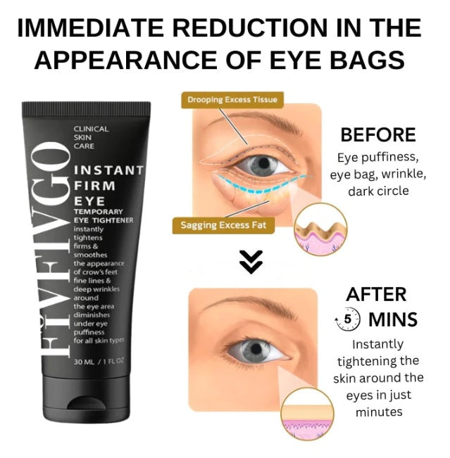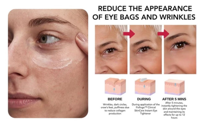 Το Fivfivgo™ Clinical SkinCare Άμεση σύσφιξη ματιών, έχει σχεδιαστεί για να παρέχει ένα προσωρινό αποτέλεσμα σύσφιξης γύρω από τα μάτια.  Το προϊόν πιθανότατα περιέχει συστατικά που δημιουργούν ένα φιλμ ή στρώμα στην επιφάνεια του δέρματος, προκαλώντας μια στιγμιαία μείωση της εμφάνισης των σακουλών και των ρυτίδων των ματιών.Αυτό μπορεί να δώσει την ψευδαίσθηση μιας πιο λείας και σφριγηλής επιδερμίδας. Υποτίθεται ότι λειτουργεί αποτελεσματικά σε μόλις 5 λεπτά μετά την εφαρμογή, συσφίγγοντας άμεσα το δέρμα γύρω από τα μάτια και διατηρώντας τα αποτελέσματά του για έως και 12 ώρες. Η σύνθεση μπορεί επίσης να περιλαμβάνει ενυδατικούς παράγοντες για την ενυδάτωση του δέρματος, συμβάλλοντας σε μια πιο νεανική και ανανεωμένη εμφάνιση. Είναι σημαντικό να σημειωθεί ότι τα αποτελέσματα είναι πιθανότατα προσωρινά και η συνεχής χρήση του προϊόντος είναι απαραίτητη για σταθερά αποτελέσματα.