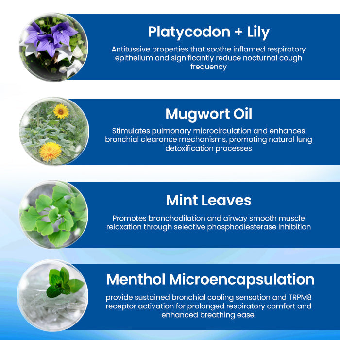 Σε αντίθεση με τα από του στόματος φάρμακα που περνούν από το πεπτικό σύστημα, το επίθεμα μεταφέρει τις δραστικές ενώσεις απευθείας μέσω του δέρματος στο στήθος ή στην άνω πλάτη—κοντά στους πνεύμονες. Αυτό επιτρέπει ταχύτερη, πιο στοχευμένη απορρόφηση, μειώνοντας τη φλεγμονή, καθαρίζοντας τη βλέννα και βελτιώνοντας τη ροή αέρα ακριβώς εκεί που χρειάζεται περισσότερο.