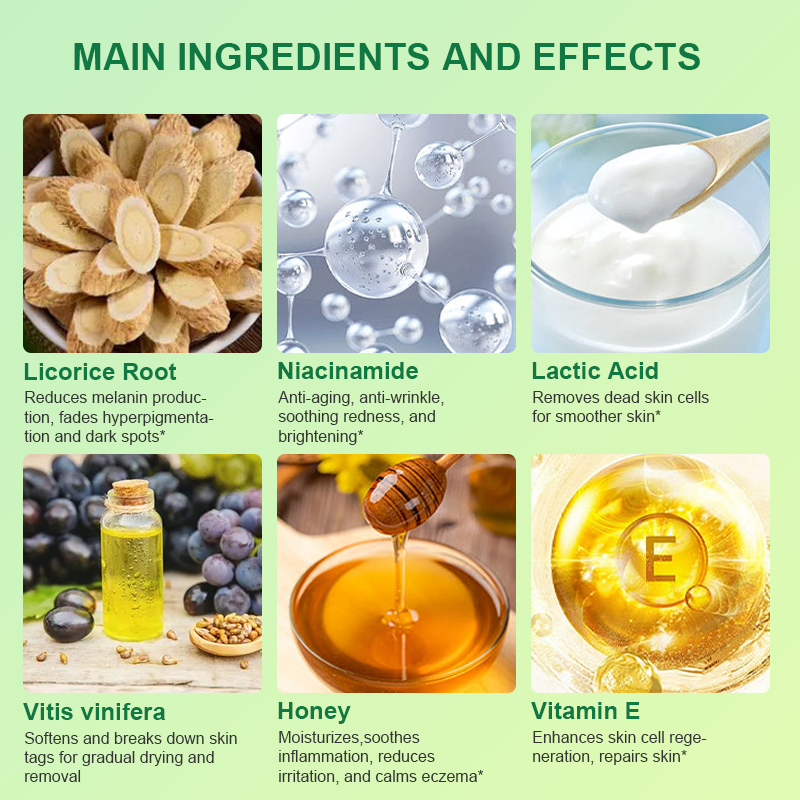 Η οξύτητα του σταφυλιού μαλακώνει και διασπά τη δομή των ιστών των δερματικών ατελειών. Τις προκαλεί να στεγνώσουν και τελικά να πέσουν. Η βιταμίνη Ε υποστηρίζει την επιδιόρθωση του δέρματος και μειώνει τις φλεγμονές. Αυτά τα συστατικά όχι μόνο βοηθούν στην αφαίρεση των δερματικών ετικετών αλλά επίσης επιταχύνουν τη διαδικασία επούλωσης μετά.