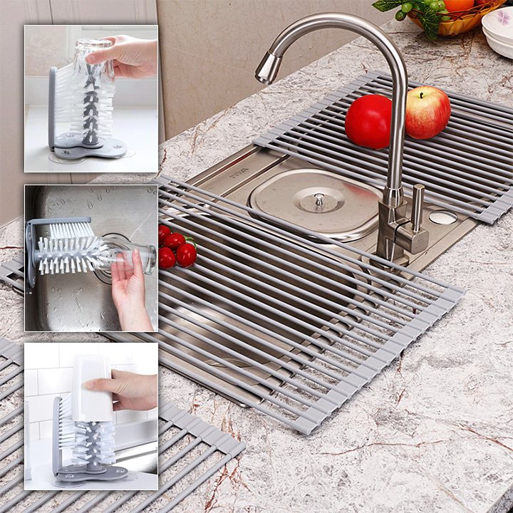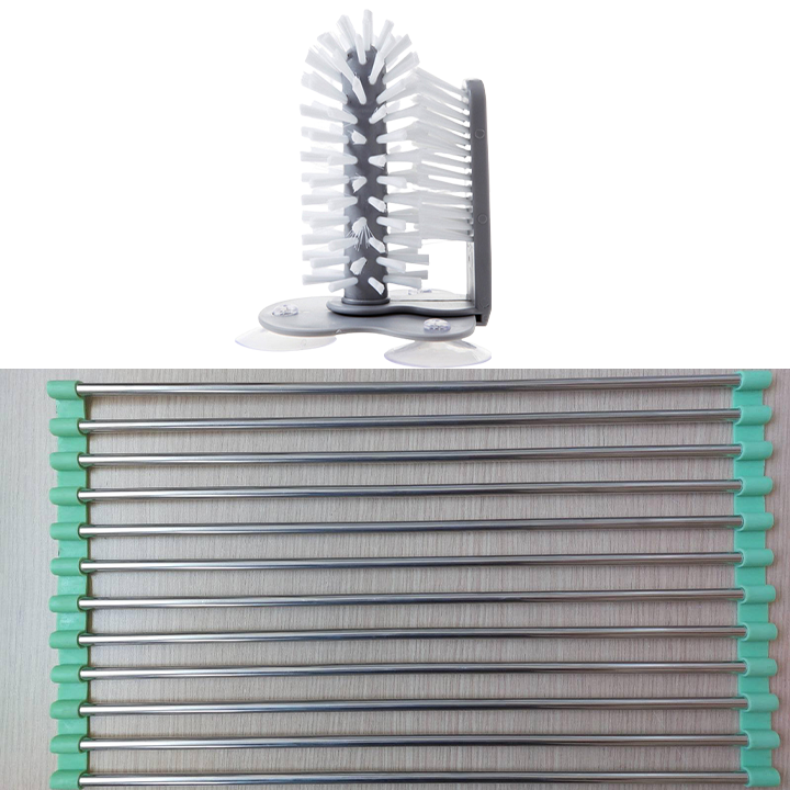 • Πρακτικά προϊόντα: Το συγκεκριμένο πακέτο θα απογειώσει την κουζίνα σας! Από τη μία, η βάση θα σας βοηθήσει να διατηρήσετε τον πάγκο σας καθαρό και οργανωμένο. Λειτουργεί ως πιατοθήκη-στεγνωτήρας, σουρωτήρι και ως σχάρα-προστατευτικό πάγκου. Ο λιτός σχεδιασμός της ταιριάζει σε όλες τις κουζίνες ενώ είναι αναδιπλούμενη για εύκολη αποθήκευση, όταν δεν χρησιμοποιείται. Από την άλλη, η διπλή βούρτσα καθαρίζει κάθε είδους γυαλικά, όπως ποτήρια νερού, κούπες, φλιτζάνια, μπιμπερό, θερμούς και παγούρια, μπουκάλια μπύρας, ποτήρια κρασιού, δοχεία, βάζα, κλπ, χωρίς να χρειάζεται να επιμένετε σε ένα σημείο για πολύ ώρα, ούτε να ξοδεύετε μεγάλη ποσότητα απορρυπαντικού.