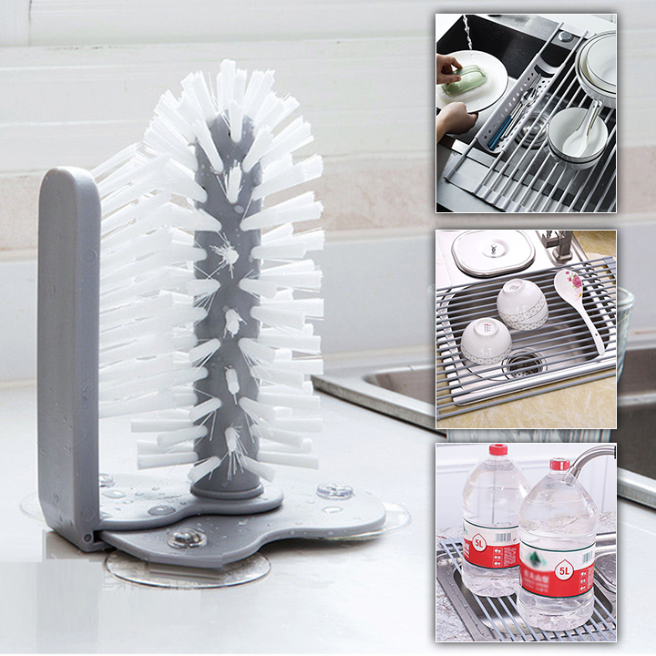 Σετ Ανοξείδωτη Βάση Νεροχύτη Που Διπλώνει & Διπλή Βούρτσα Καθαρισμού Ποτηριών