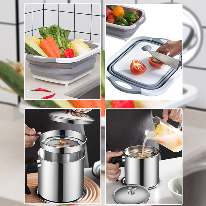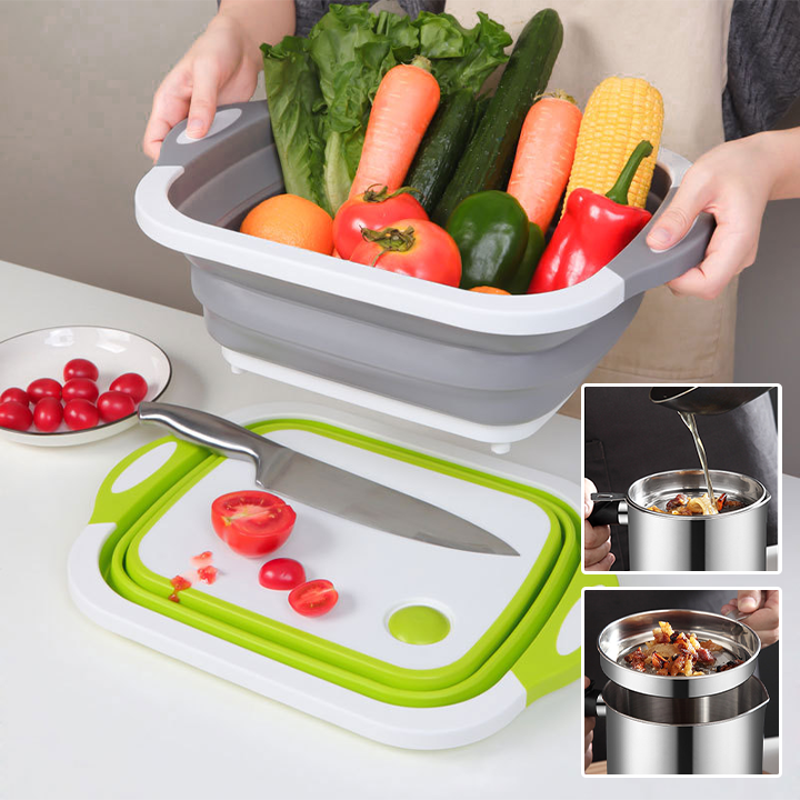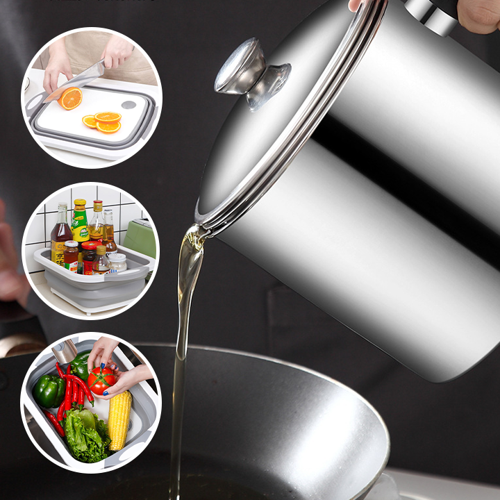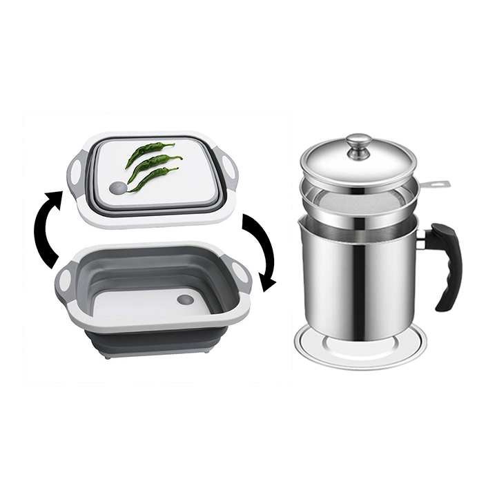 • 1 x ΣΕΤ Πτυσσόμενος Πολυλειτουργικός Δίσκος Κοπής & Ανοξείδωτο Δοχείο Λαδιού Με Φίλτρο