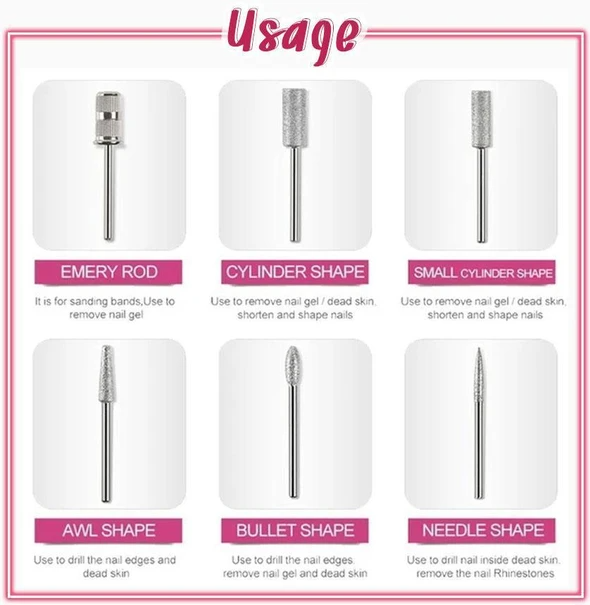 • Πολυλειτουργικό: Το σετ περιλαμβάνει έξι (6) βασικές μεταλλικές κεφαλές και έξι (6) κεφαλές λείανσης (τροχολιθάκια). Αφαιρεί με ευκολία το ήδη υπάρχον υλικό από τα νύχια σας (απλό βερνίκι, ημιμόνιμο, ακρυλικό, τζελ). Έπειτα, τα  λιμάρει, τα στιλβώνει, τα γυαλίζει και παράλληλα, αφαιρεί τους κάλους και τις παρανυχίδες από τα δάχτυλά σας.