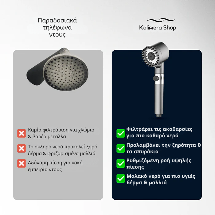 Το φίλτρο Kalimera, χάρη στα 18 στάδια καθαρισμού του, απομακρύνει αυτές τις ακαθαρσίες και μεταμορφώνει το ντους σας σε πραγματική περιποίηση.