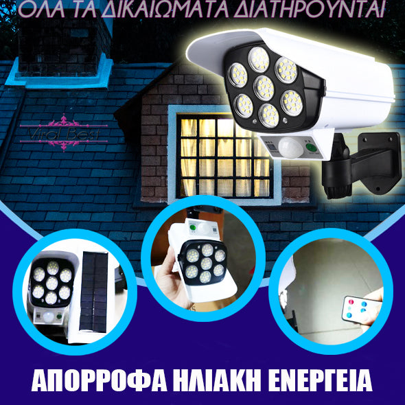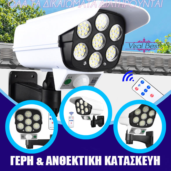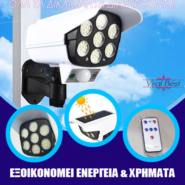 Χάρη στα εβδομήντα επτά (77) φωτάκια LED, τον αισθητήρα κίνησης, την ελαφριά κλίση και την εικονική, αλλά αληθοφανή κάμερα ασφαλείας, ο ηλιακός προβολέας απομακρύνει τους επίδοξους εισβολείς και διατηρεί τον χώρο σας ασφαλή!