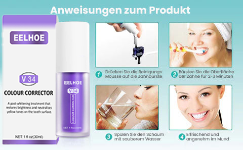 v34: Χρησιμοποιεί τεχνικές διόρθωσης χρώματος, όχι χημικές θεραπείες λεύκανσης. Το βιολετί είναι ακριβώς το αντίθετο από το κίτρινο χρώμα στον χρωματικό κύκλο και επομένως είναι ένα συμπληρωματικό χρώμα. Η εφαρμογή βιολετί στα δόντια σας εξουδετερώνει τον κίτρινο τόνο, καλύπτει τους λεκέδες και ενισχύει τη λάμψη, δίνοντάς σας ένα σημαντικά πιο φωτεινό λευκό χρώμα.