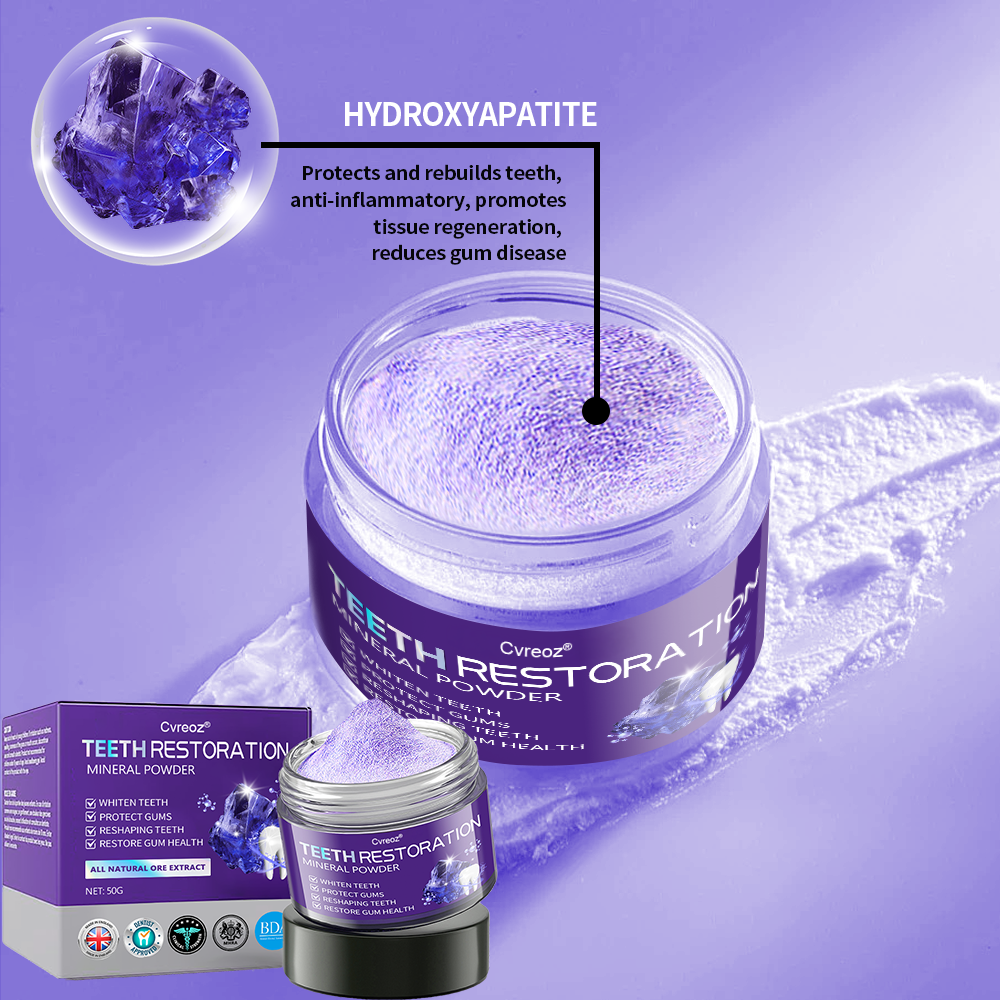 Η ειδικά σχεδιασμένη Ορυκτή Σκόνη Αποκατάστασης Δοντιών χρησιμοποιεί τη θεραπεία επαναμεταλλοποίησης για την επαναμεταλλοποίηση της απομεταλλωμένης αδαμαντίνης ή του τσιμέντου, αποκαθιστώντας τη σκληρότητά της και σταματώντας ή εξαλείφοντας τις τερηδονικές βλάβες.