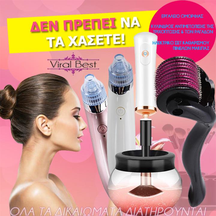 Εδώ αγαπάμε τις γυναίκες και το δείχνουμε έμπρακτα! Σας προσφέρουμε το απόλυτο εργαλείο ομορφιάς, τον πολυσυζητημένο κύλινδρο αντιμετώπισης της τριχόπτωσης και των ραγάδων και το ηλεκτρικό σετ καθαρισμού πινέλων μακιγιάζ σε τιμή ΣΟΚ έτσι, ώστε κάθε μία από εσάς να μπορεί να το αποκτήσει!
